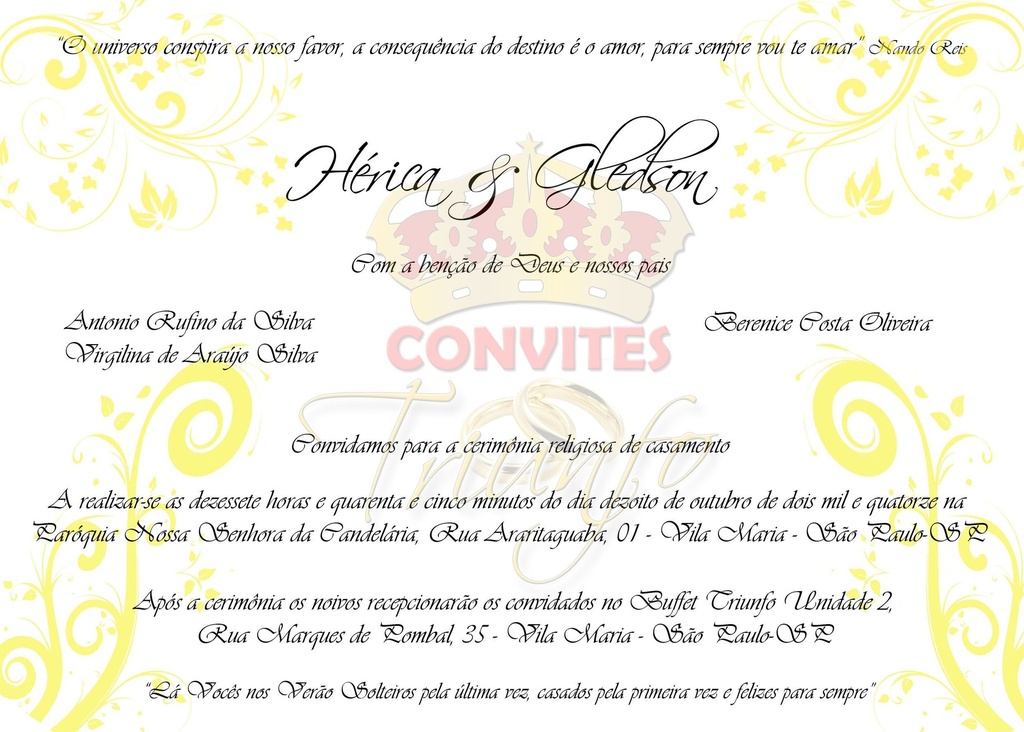A Convites Triunfo lhe oferece convites de qualidade, bonitos e baratos com prazo de entrega de apenas 1 (um) dia após aprovação do layout. Enviamos para todo o Brasil. Elaboramos também convites personalizados, para festas infantis, chá de cozinha, chá de lingerie, bodas, empresariais, entre outros, faça seu contato por telefone ou e-mail para nos explicar o que precisa para montarmos um layout personalizada para você.
