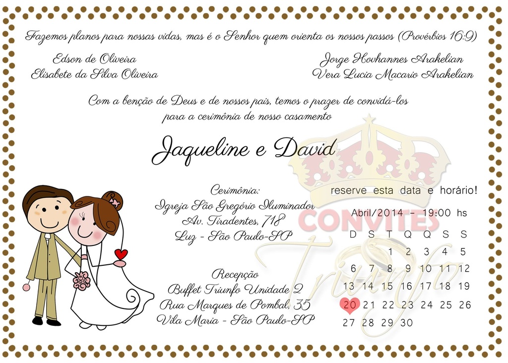 A Convites Triunfo lhe oferece convites de qualidade, bonitos e baratos com prazo de entrega de apenas 1 (um) dia após aprovação do layout. Enviamos para todo o Brasil. Elaboramos também convites personalizados, para festas infantis, chá de cozinha, chá de lingerie, bodas, empresariais, entre outros, faça seu contato por telefone ou e-mail para nos explicar o que precisa para montarmos um layout personalizada para você.