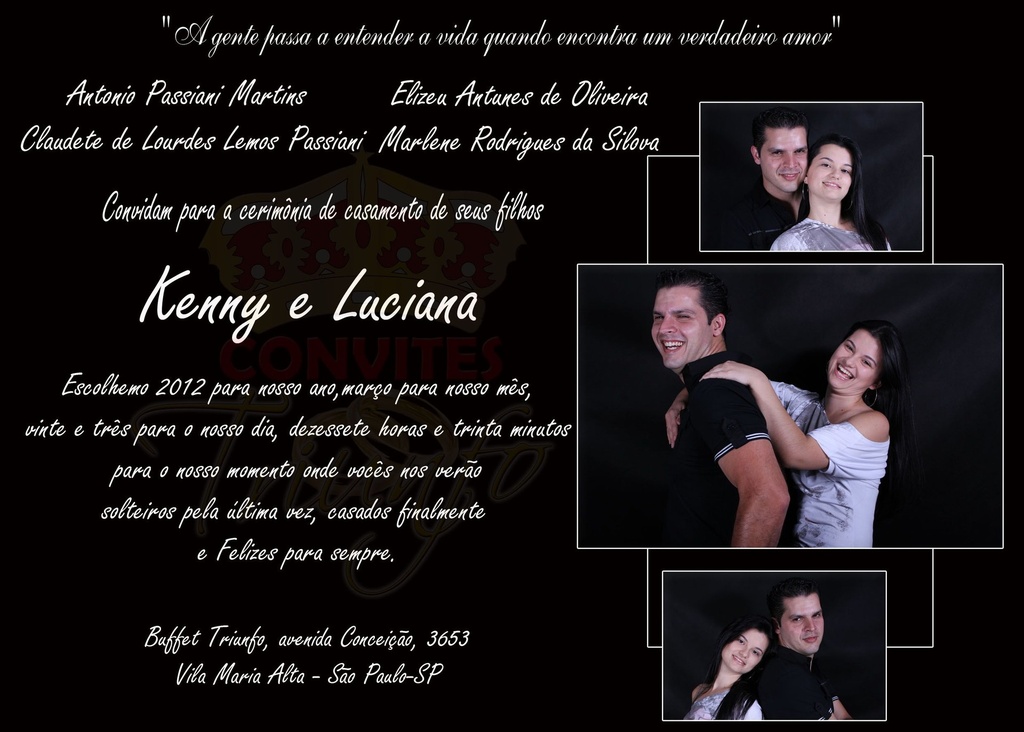 A Convites Triunfo lhe oferece convites de qualidade, bonitos e baratos com prazo de entrega de apenas 1 (um) dia após aprovação do layout. Enviamos para todo o Brasil. Elaboramos também convites personalizados, para festas infantis, chá de cozinha, chá de lingerie, bodas, empresariais, entre outros, faça seu contato por telefone ou e-mail para nos explicar o que precisa para montarmos um layout personalizada para você.