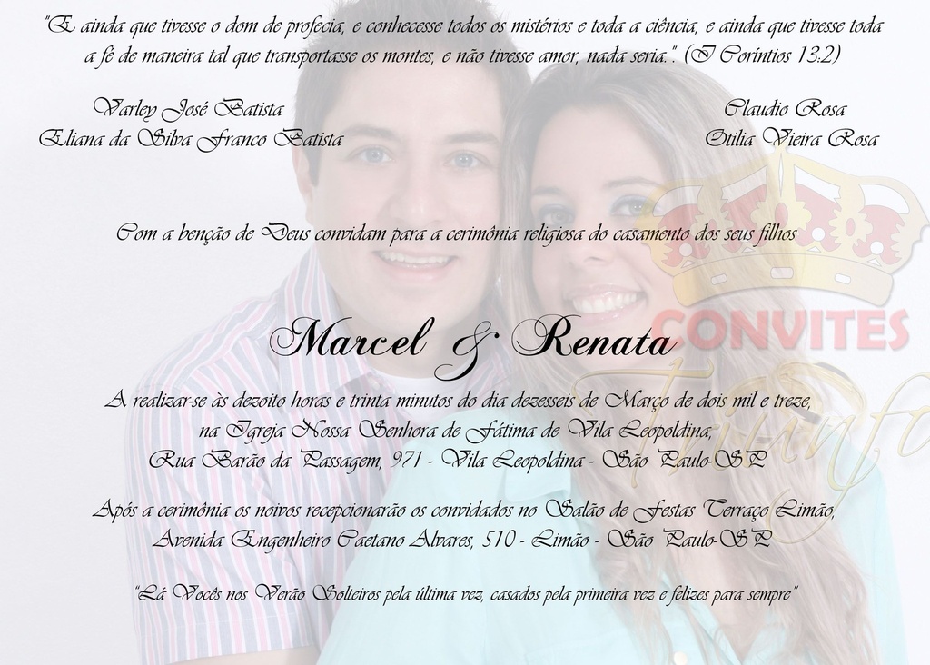 A Convites Triunfo lhe oferece convites de qualidade, bonitos e baratos com prazo de entrega de apenas 1 (um) dia após aprovação do layout. Enviamos para todo o Brasil. Elaboramos também convites personalizados, para festas infantis, chá de cozinha, chá de lingerie, bodas, empresariais, entre outros, faça seu contato por telefone ou e-mail para nos explicar o que precisa para montarmos um layout personalizada para você.